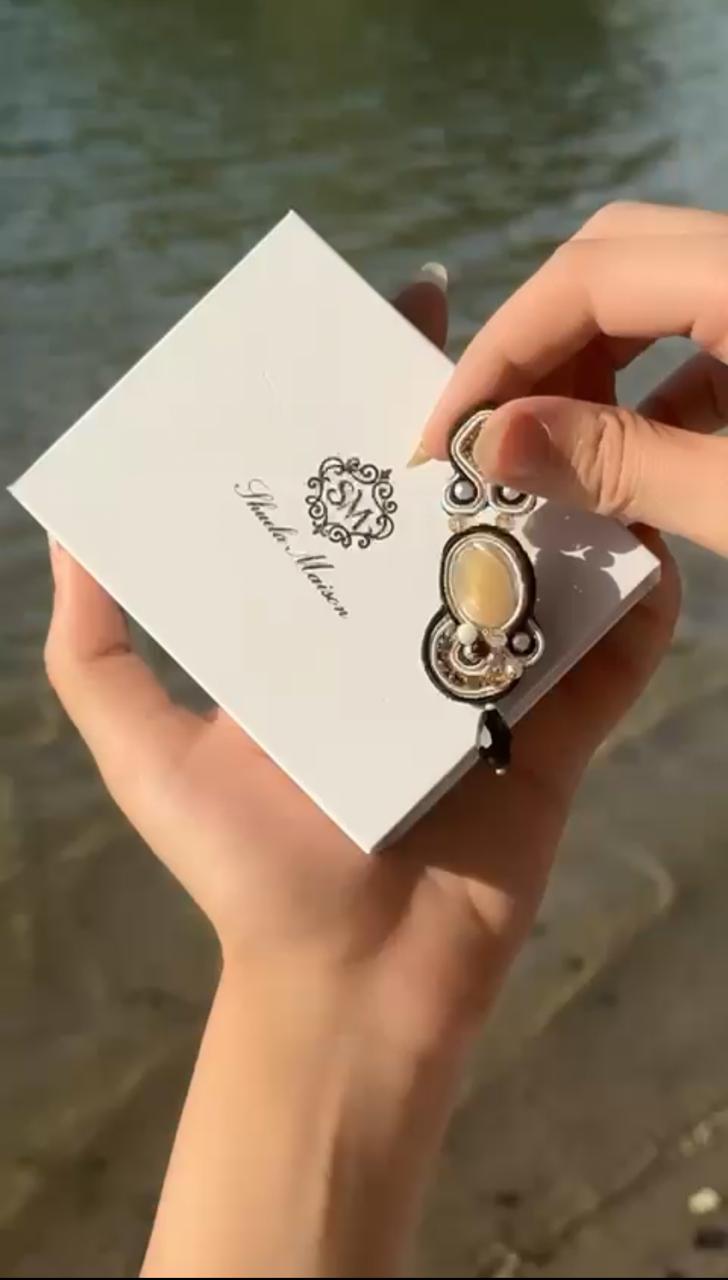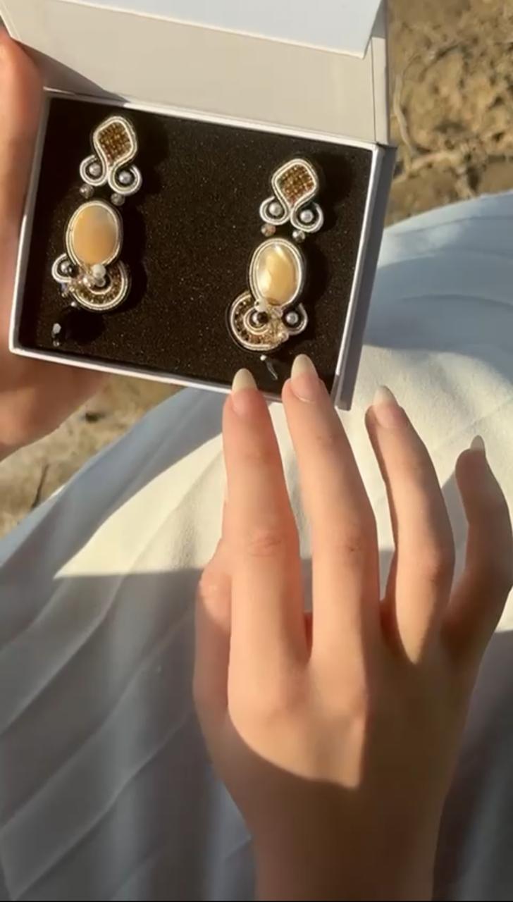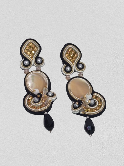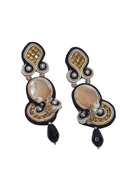 Mother-of-pearl (cappuccino), rhinestones, faceted black crystal drop, hand-stitched textile detailing · For pierced ears