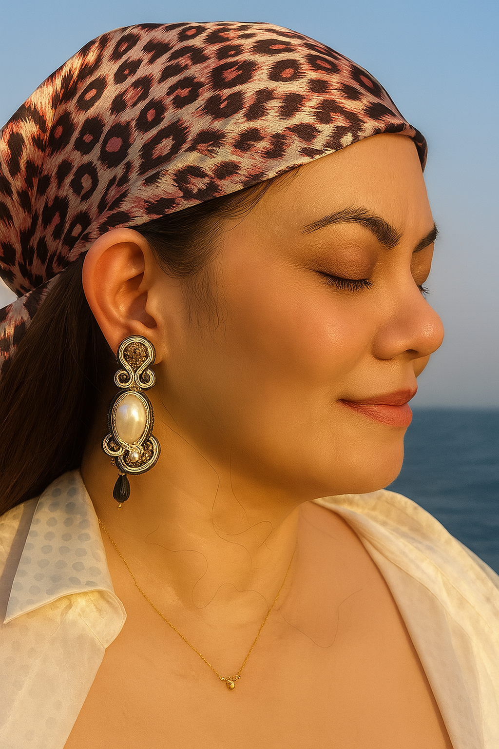 Hand-finished in Italy, Vanessa pairs warm cappuccino mother-of-pearl with a sparkle of golden rhinestones and a sleek black crystal drop. The contrast of soft neutrals and inky black creates a refined, modern drama that flatters both daywear and after-dark looks.