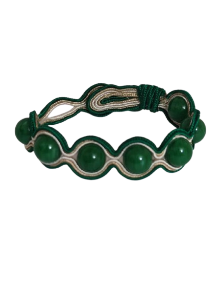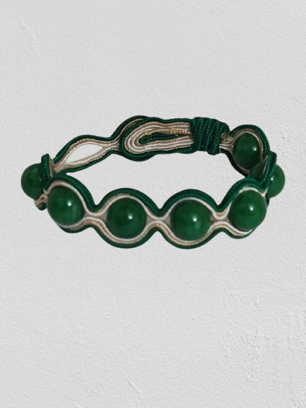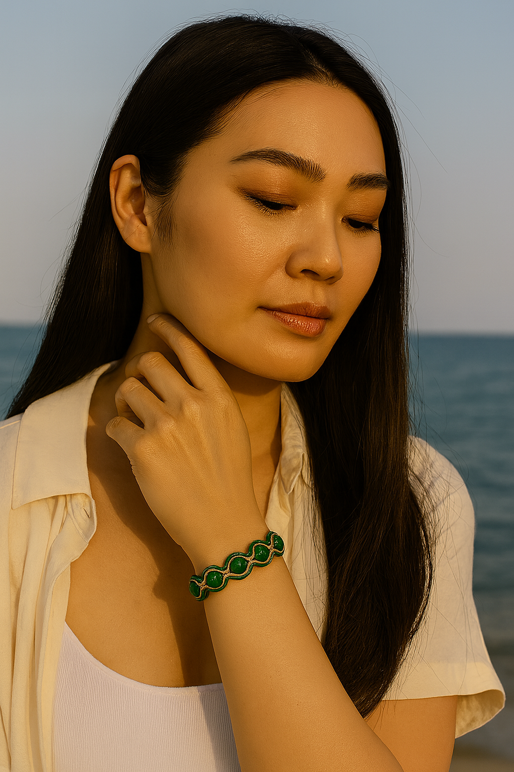 Green agate, emerald-tone textile embroidery; adjustable cuff (one size, gentle flex)