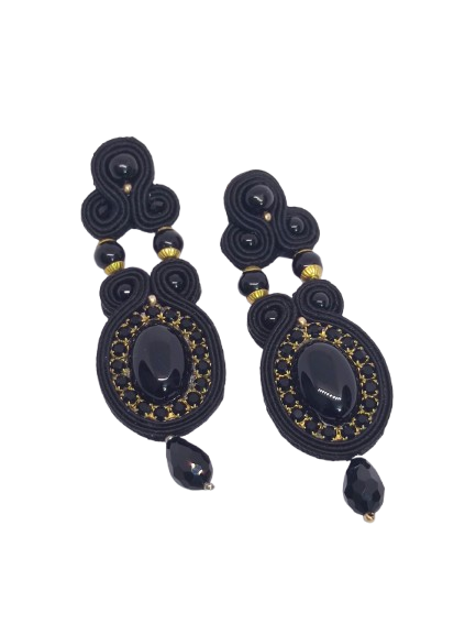 Handmade in Italy, Veronica – Black Onyx Collection pairs a polished black onyx cabochon with a radiant halo of golden crystals and sculpted soutache embroidery. The elongated silhouette creates a bold yet graceful line, finished with a faceted crystal drop that adds fluid, light-catching movement.
