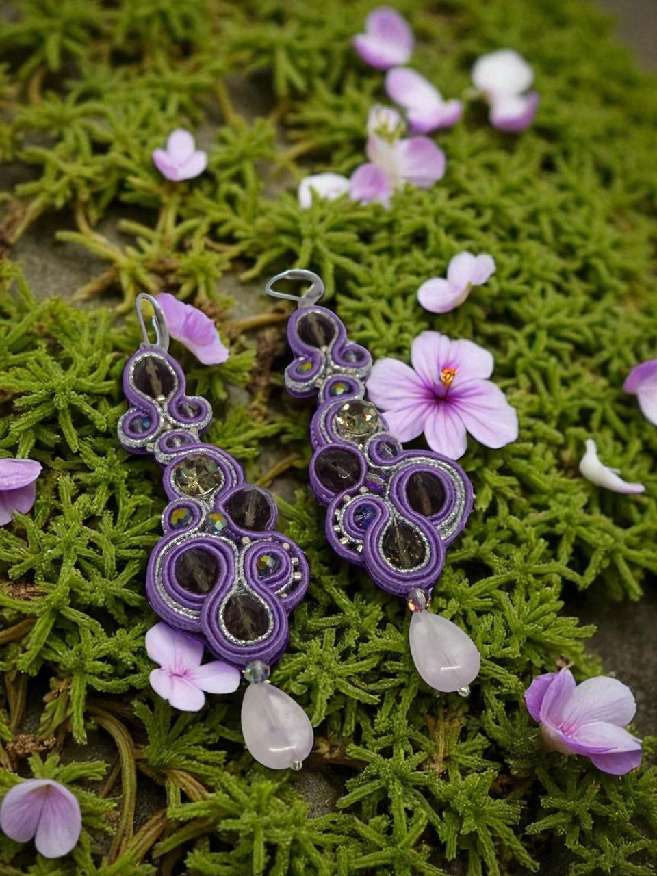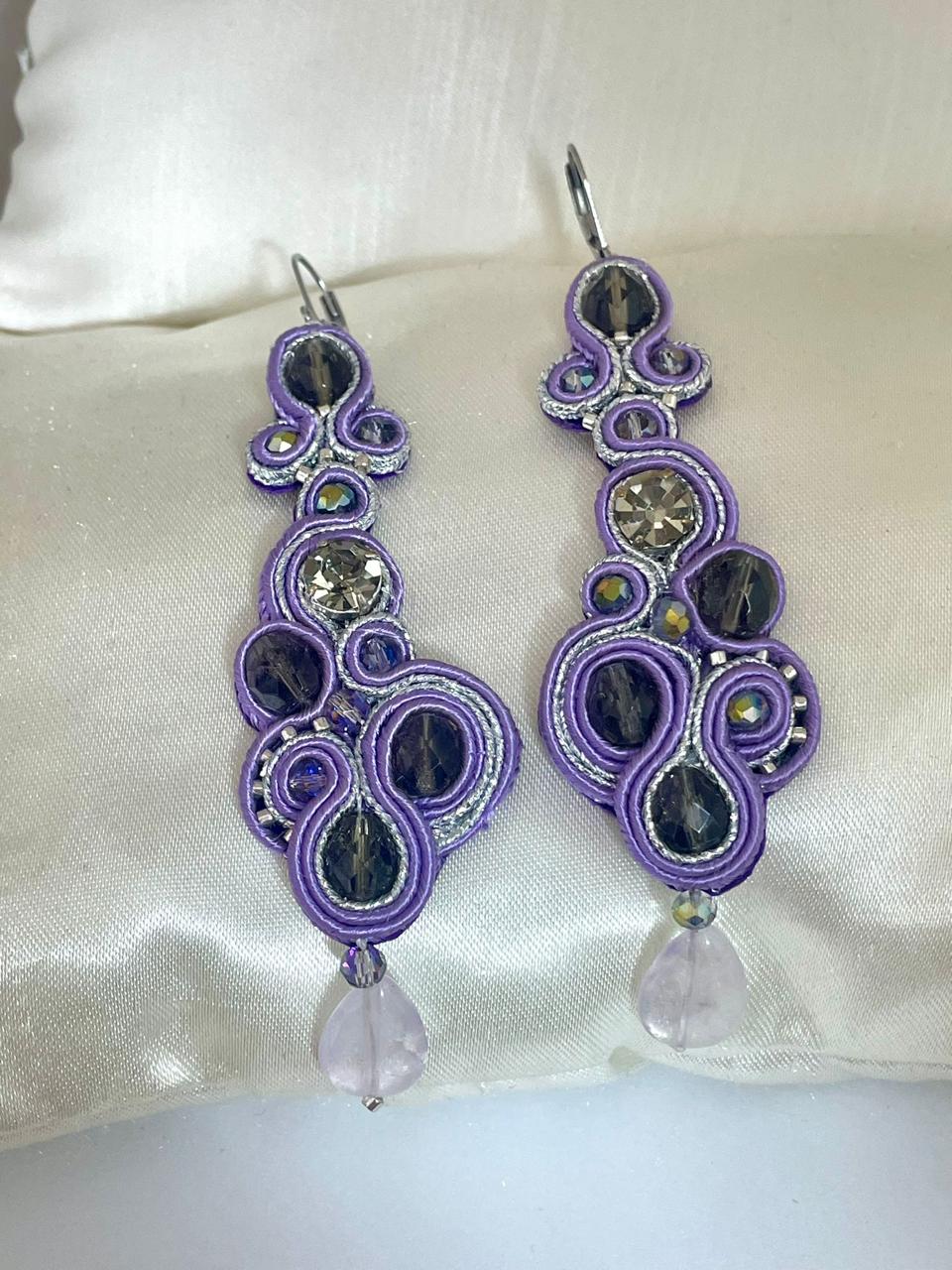Crafted by hand in Italy, they feature deep violet tones, crystal reflections, and soft silver accents that capture the poetry of femininity. Each detail — from the gentle curve of the design to the luminous drop — evokes sophistication and charm.