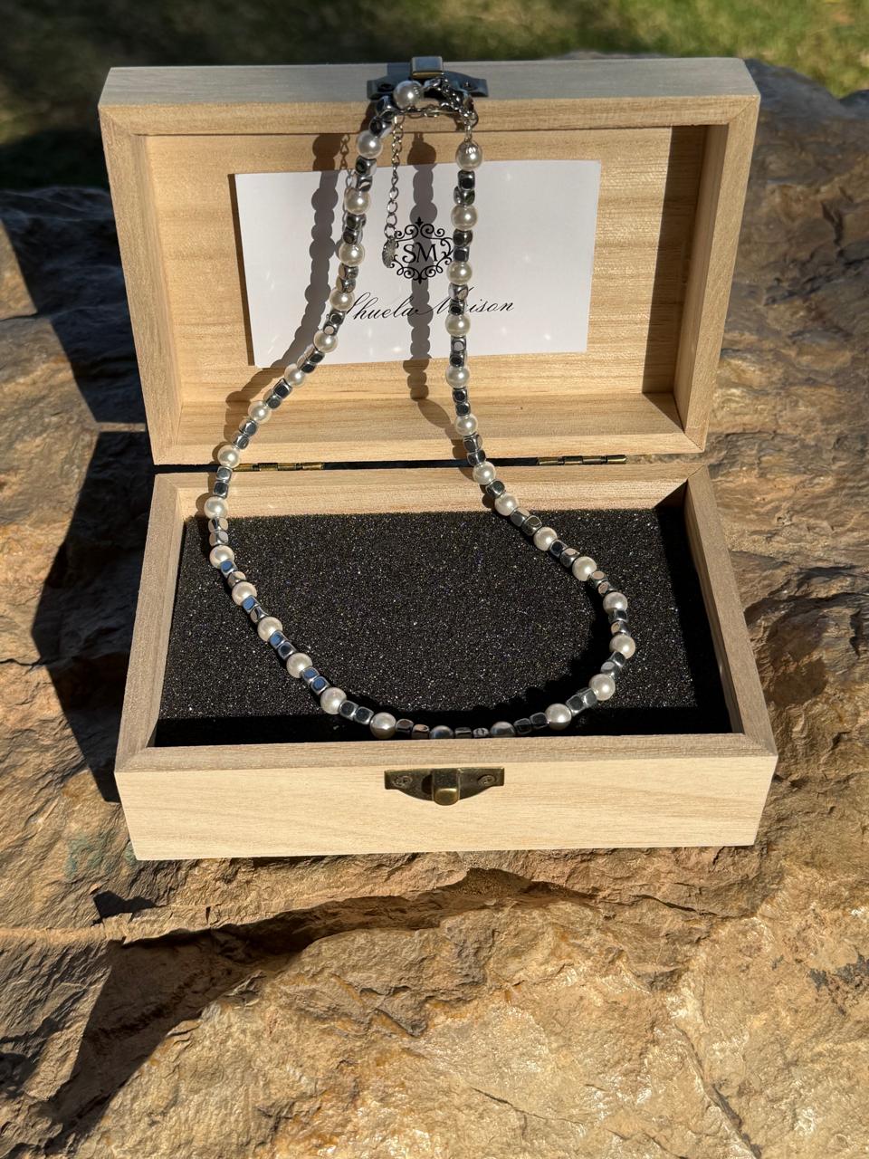 Handmade in Italy, Argento di Notte – Majorca Pearl Signature combines the soft, timeless glow of Majorca pearls with the sharp, architectural rhythm of silver hematite cubes. The result is a necklace that feels minimalist yet luxurious — refined in its simplicity, bold in its balance.