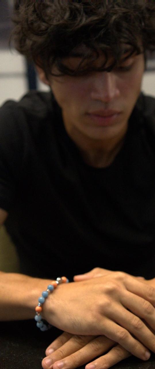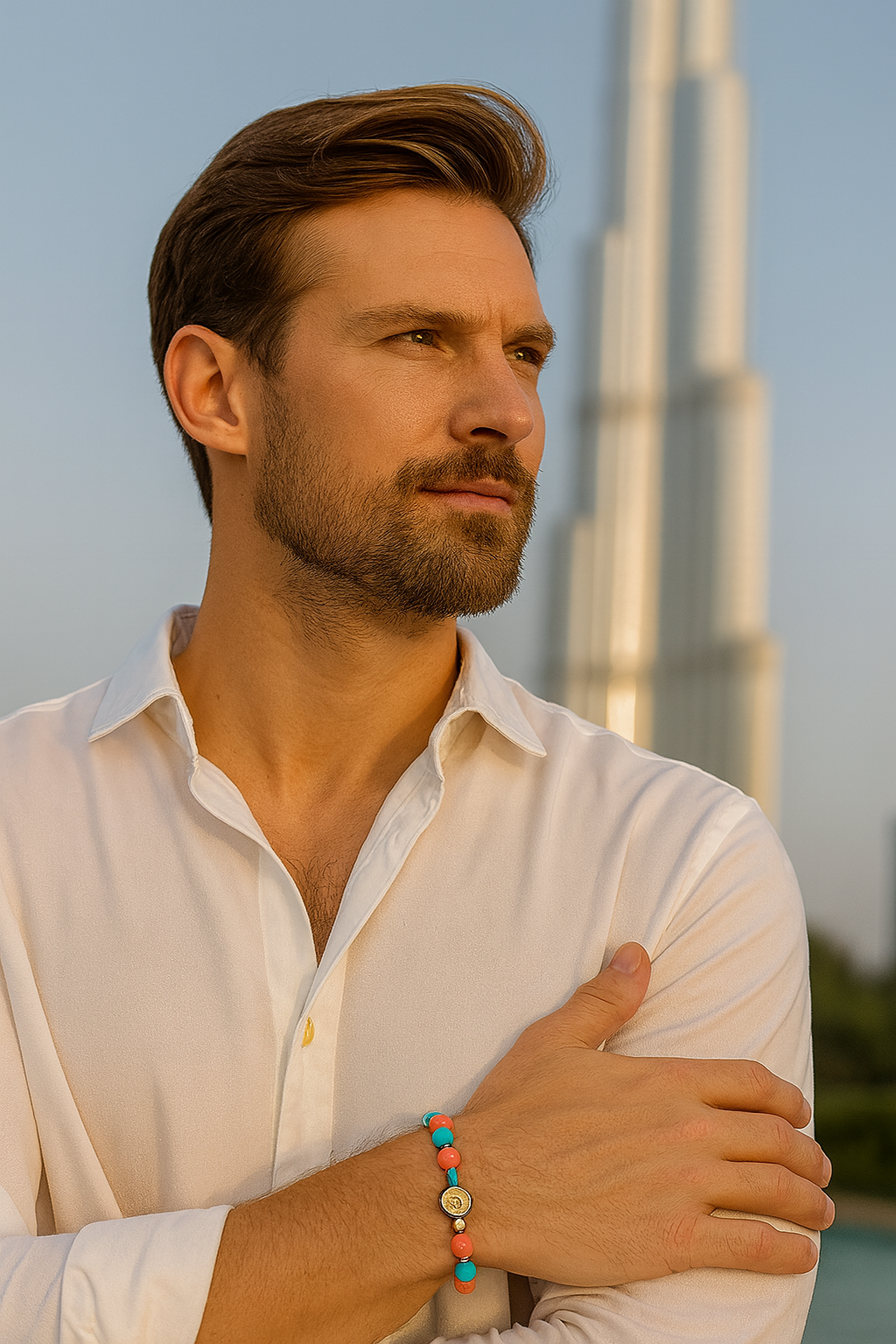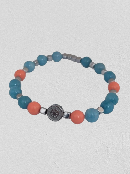Handmade in Italy, Sir Edwin sets a sleek hematite anchor plate amid ocean-toned Tiffany agate and refined pink-coral notes. The brushed hematite geometry adds a clean, masculine edge—sharp solo or paired with your watch.