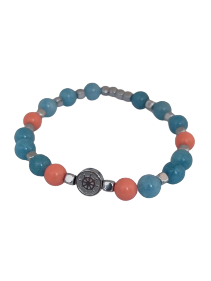 Hematite plate with anchor, pink coral plate/beads, Tiffany agate, hematite cubes · Elastic fit