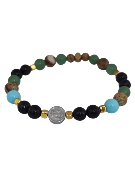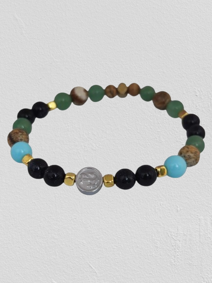 Hematite Plate with Anchor, Turquoise Paste, Blue Sunstone, Green Agate, Paesina Stone, Gold-Plated Hematite Cubes