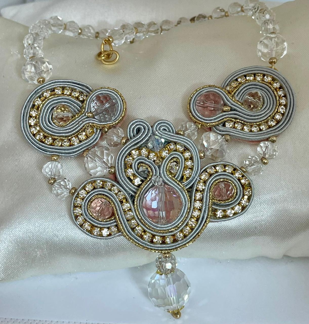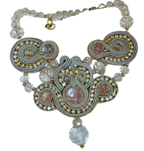 This statement piece combines hand-faceted clear crystals, gold and silver accents, and delicately embedded pearls to create a radiant balance between strength and grace.