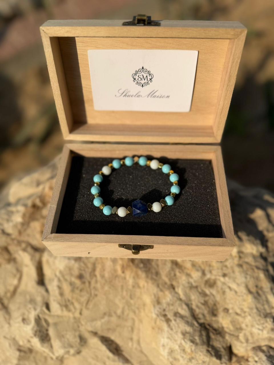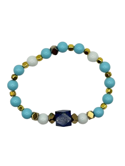 Handmade in Italy, Sir Luxury – Lapis & Sunstone Glow combines the intense cosmic blue of lapis with the clean luminosity of white agate and the warm shimmer of natural sunstones. Gold-plated hematite cubes bring structure and a polished geometric touch, creating a bracelet that feels both modern and timeless.