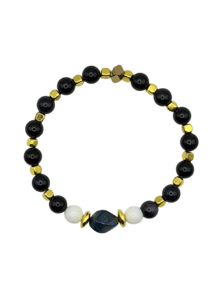 Handmade in Italy, Sir Luxury – Lapis & Sunstone Flowers combines the deep richness of natural lapis with the softness of white agate and the warm radiance of sunstone flower beads. Gold-plated hematite cubes add structure and a geometric edge, giving the bracelet a sophisticated, modern silhouette.
