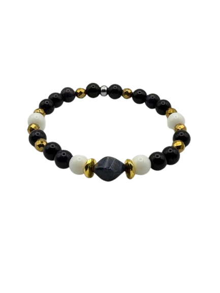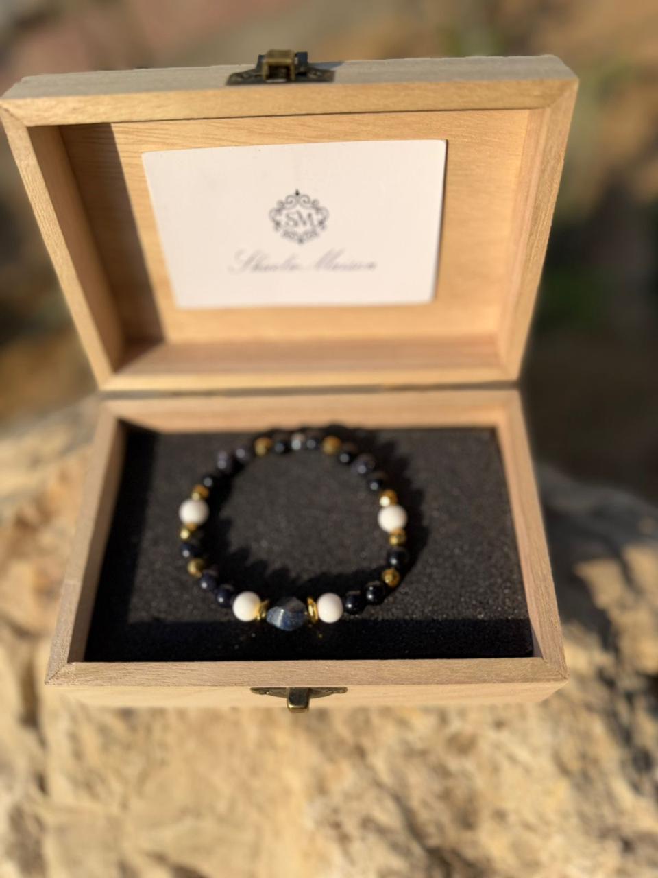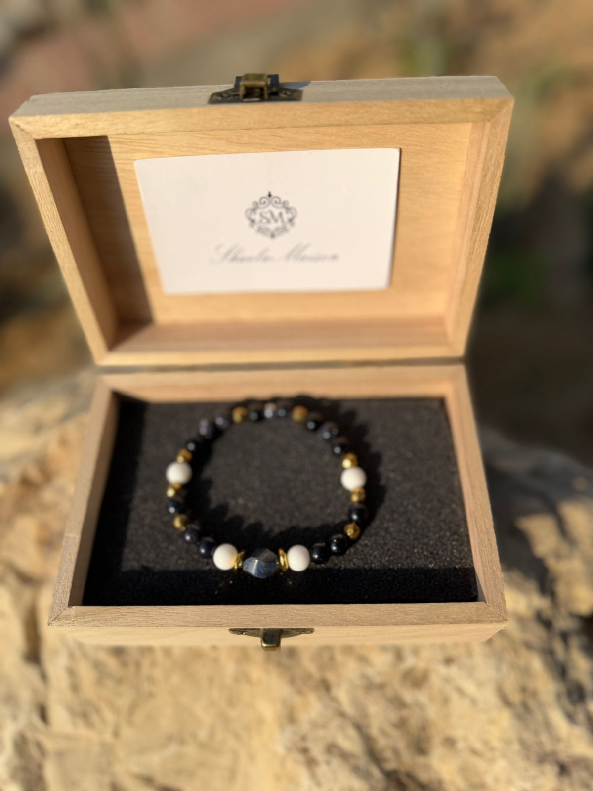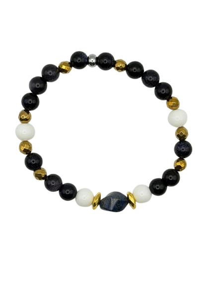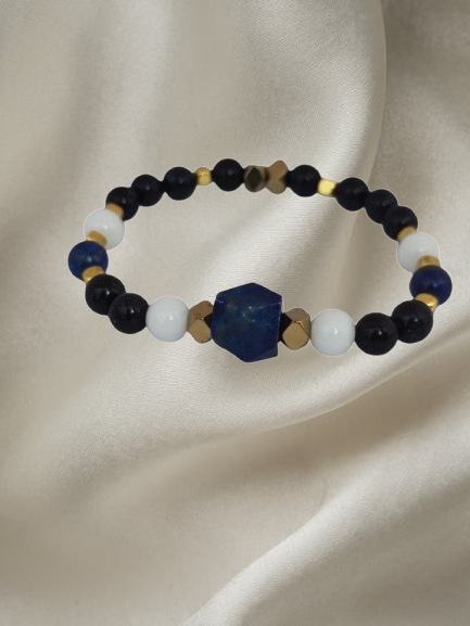 Handmade in Italy, Sir Luxury balances a deep lapis focal with sea-blue agates and sleek gold-plated hematite. A clean, modern palette that pairs effortlessly with a watch or stands alone with quiet sophistication.