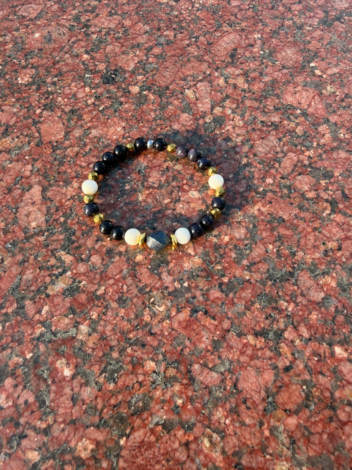 حجر لازورد · معجون عقيق الفيروز · عقيق مخطط بالأزرق · مكعبات هيماتيت مطلية بالذهب · سوار مرن