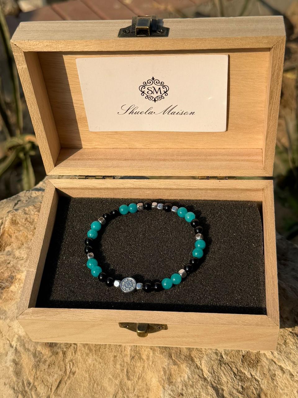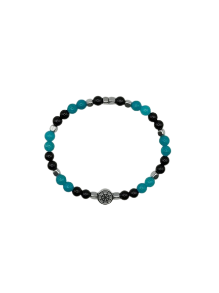 Handmade in Italy, Sir Edwin – Anchor & Onyx Contrast blends the intensity of polished onyx with the fresh teal tones of Tiffany agate. At the center, a smooth hematite anchor plate adds a bold, masculine focal point. Sleek hematite cubes refine the structure with minimalist geometry and a clean metallic edge.